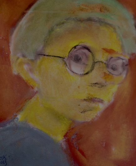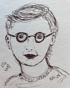 Forfatterportræt udført i tusch af Rikke Aarøe Carlsen.
