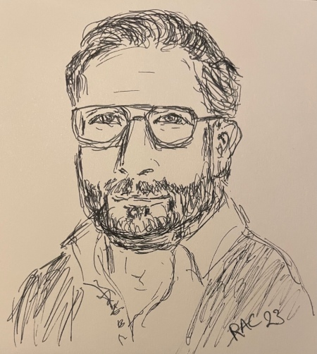 Forfatterportræt i tusch tegnet af Rikke Aarøe Carlsen.