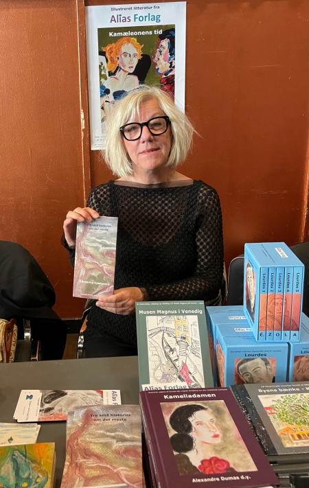 Susanne Kjærgaard var på forfattervistit hos forlagets stand en times tid ved Christianshavns Bogfestival 22. april for at promovere sin bog Tre små historier om det meste.