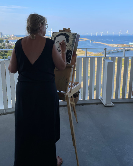Billedkunstner Rikke Aarøe Carlsen igang med en af illustrationerne til romanen 'Hanegal og Svanesang'