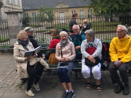 Forfatter Rikke Aarøe Carlsen læser bænke-novellen fra Nyhavn højt for gruppe på fortæller-bænken dér.