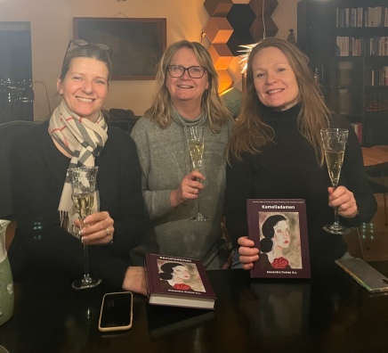 Redaktør Charlotte Ørgård Vinding, oversætter og illustrator Rikke Aarøe Carlsen og dirigent/forordsskriver Anne Marie Granau skåler på udgivelsen af Kameliadamen.